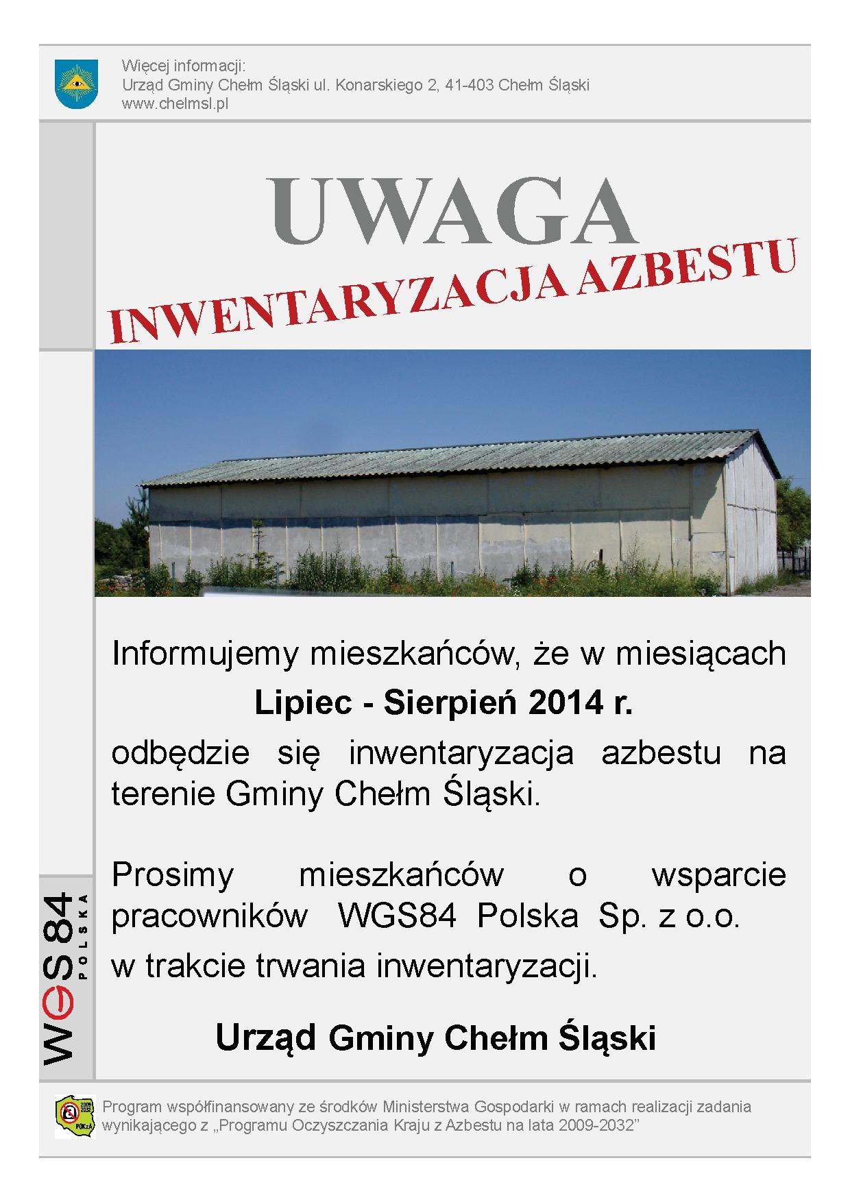 Informujemy mieszkańców, że w miesiącach Lipiec - Sierpień 2014 r. odbędzie się inwentaryzacja azbestu na