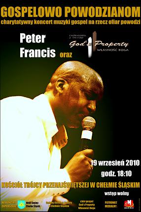 To będzie z pewnością jedno z najważniejszych wydarzeń gospelowych 2010 roku. 19 września w Chełmie Śląskim wystąpi Peter Francis z towarzyszeniem chóru gospel "God's Property- Własność Boga"!